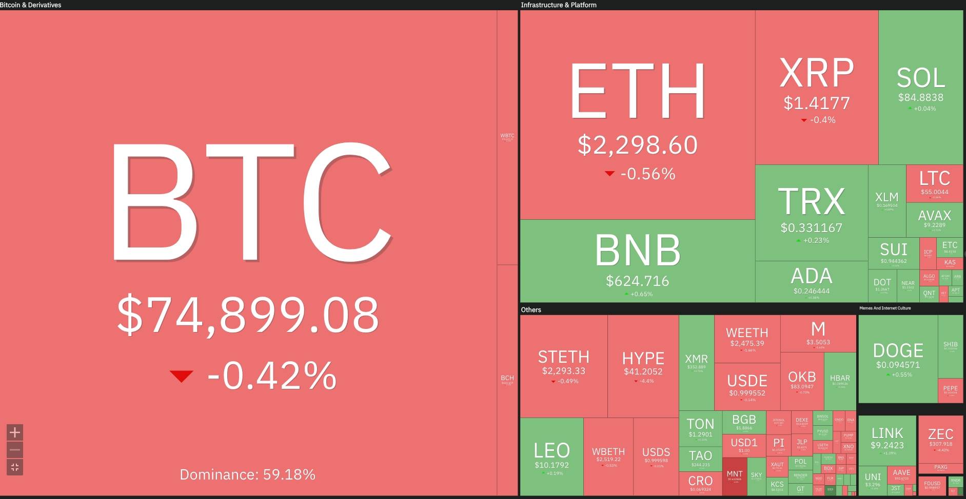 Ở chiều ngược lại, thị trường crypto phản ứng khá “cứng”. Bitcoin giảm nhẹ 0,2% trong 24h gần nhất, giữ quanh vùng 74.950 USD.
