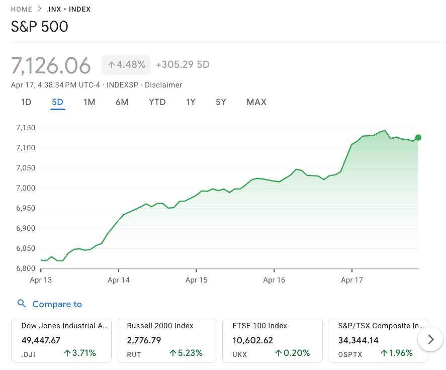 Chỉ số S&P 500 quay đầu sau chuỗi hơn 10 ngày tăng liên tiếp. Đồ thị: Google Finance (20/04/2026)