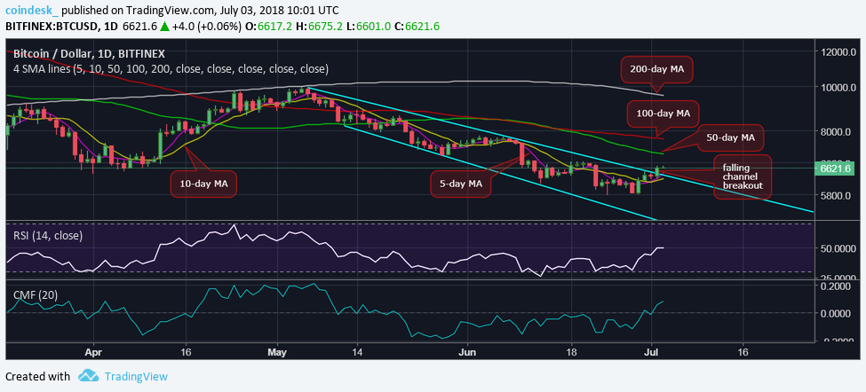 Bitcoin đã đóng nến ngày 02/07 (tính theo giờ UTC) tại $6,618, xác nhận có phá cản của kênh giảm giá (falling channel breakout). Bên cạnh đó, đường trung bình động 5 ngày (5-day MA) và 10 ngày (10-day MA) giờ cũng đang hướng lên, thể hiện sự ủng hộ cho đà đi lên của BTC.