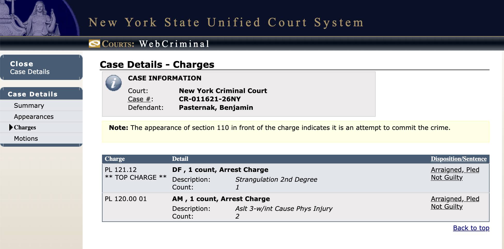 Theo hồ sơ từ Tòa án Hình sự New York, Pasternak, 26 tuổi, bị bắt giữ vì một vụ việc xảy ra vào ngày 31/03. Ông bị truy tố một tội danh siết cổ cấp độ hai và hai tội danh hành hung cấp độ ba với mục đích gây thương tích.