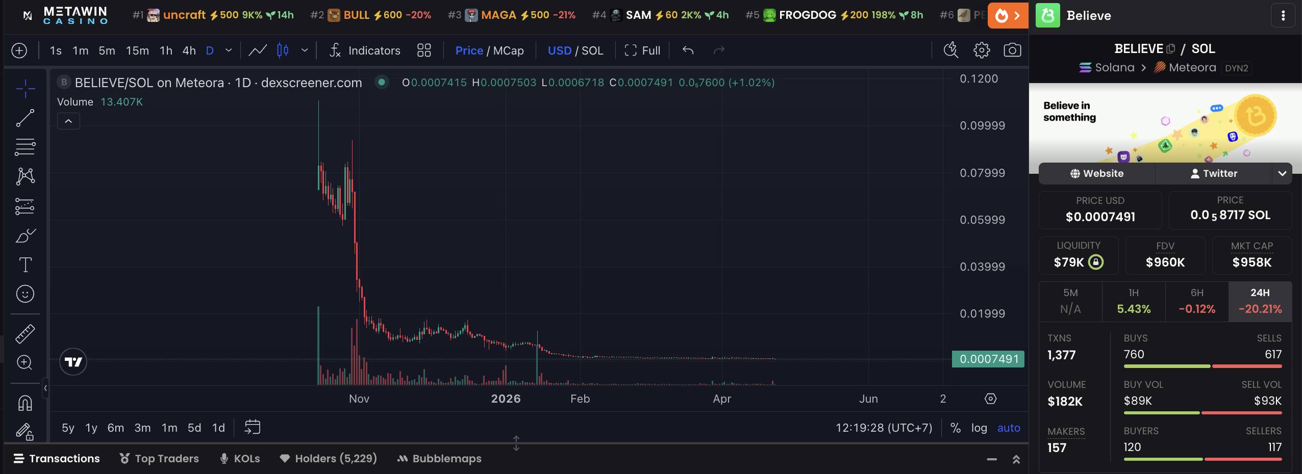 Dữ liệu trên DEX Screener cho thấy token của nền tảng Believe đã giảm tới 99,7% so với mức đỉnh đạt được vào tháng 05/2025, và hiện giao dịch quanh mức 0,0007 USD.