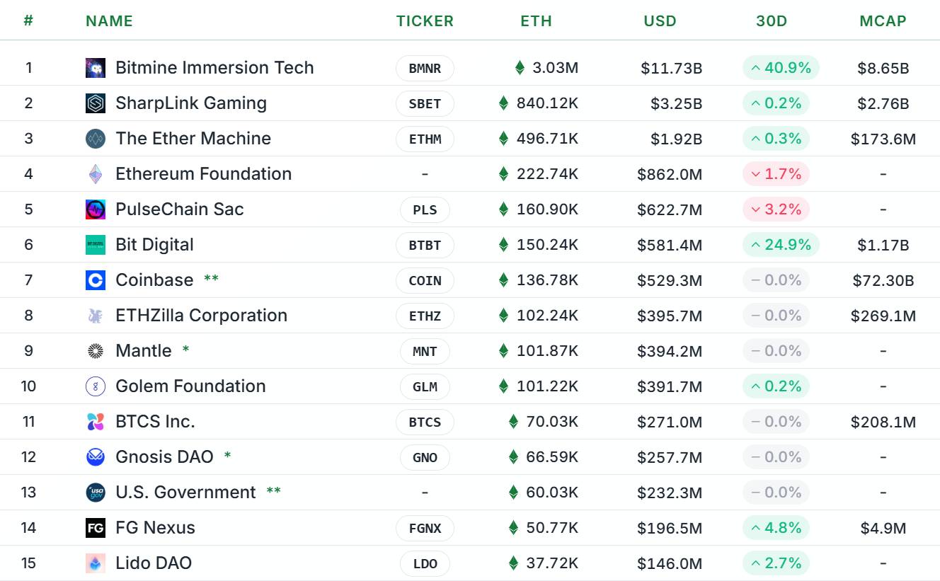 Thống kê các tổ chức đang nắm giữ nhiều ETH nhất. Nguồn: Strategic ETH Reserve (18/10/2025)