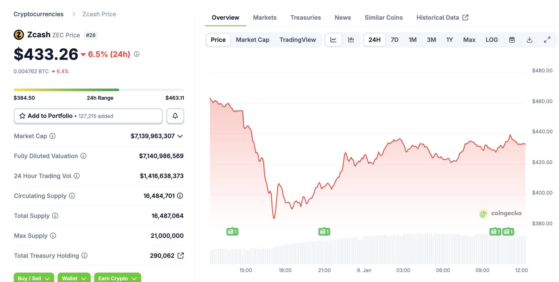 Biến động giá ZEC trong 24 giờ qua, ảnh chụp màn hình trên CoinGecko lúc 12:35 PM ngày 09/01/2026