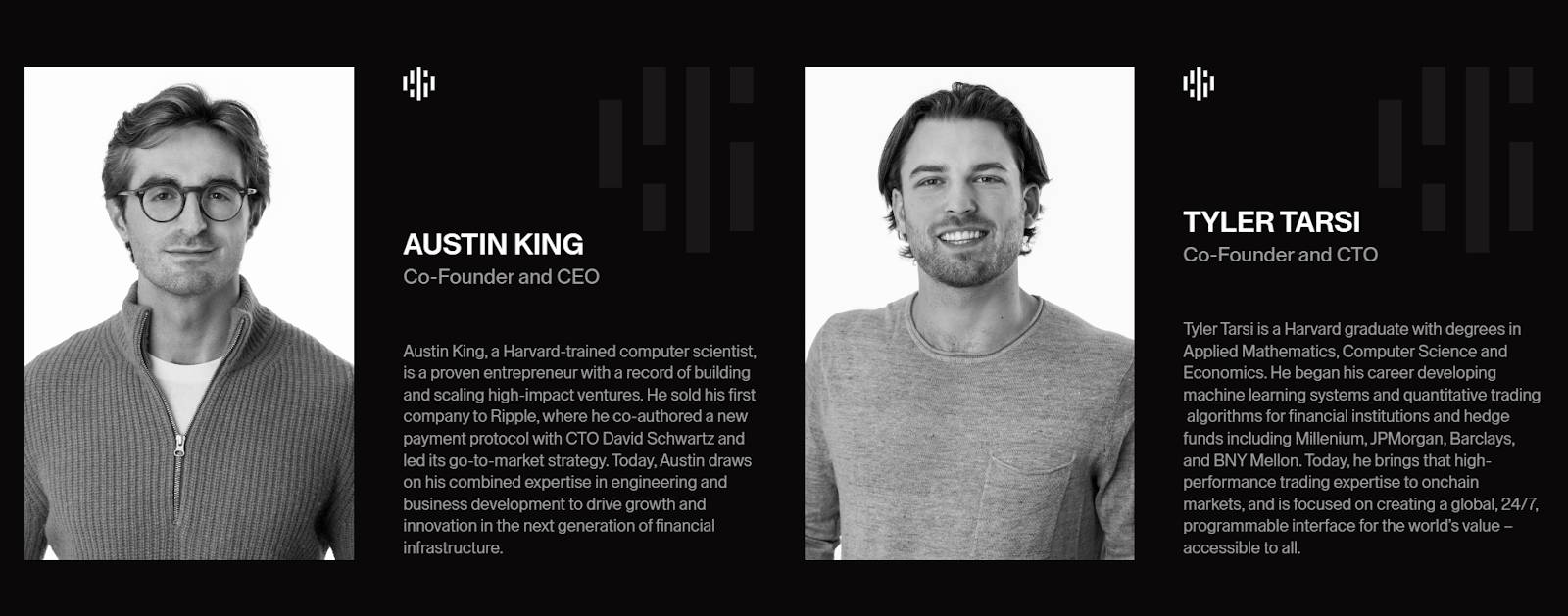 - Tyler Tarsi (Co-founder & CTO): Tốt nghiệp Harvard với các bằng về Toán ứng dụng, Khoa học máy tính và Kinh tế học. Từng phát triển hệ thống máy học và thuật toán giao dịch định lượng cho các tổ chức tài chính, quỹ đầu cơ như Millenium, JPMorgan, Barclays và BNY Mellon.
