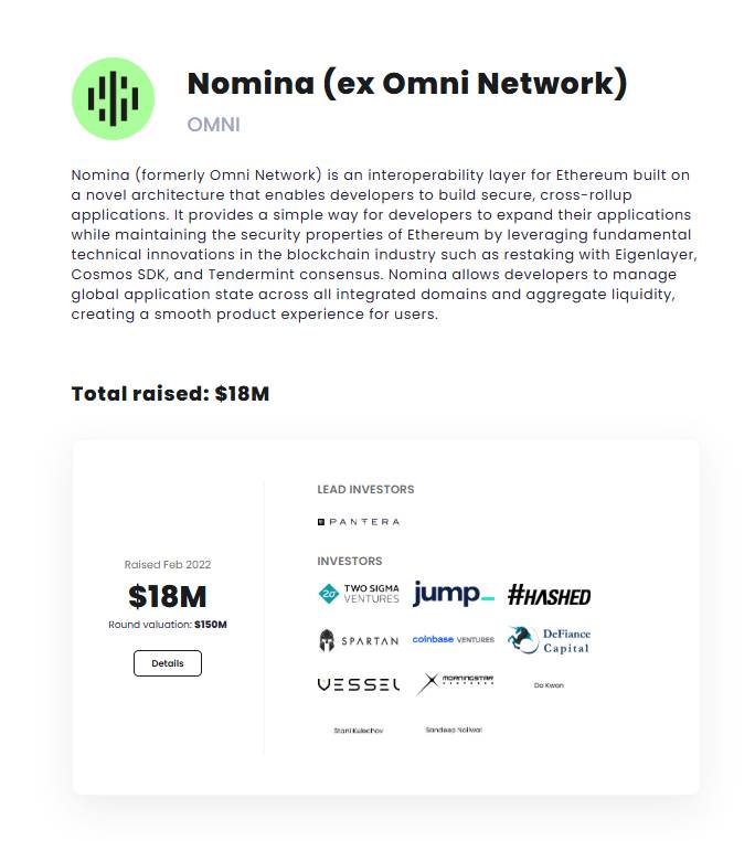 Nomina huy động được 18 triệu USD vào tháng 02/2022 từ các quỹ đầu tư như Pantera, Jump, Hashed, Spartan, Coinbase Ventures,...