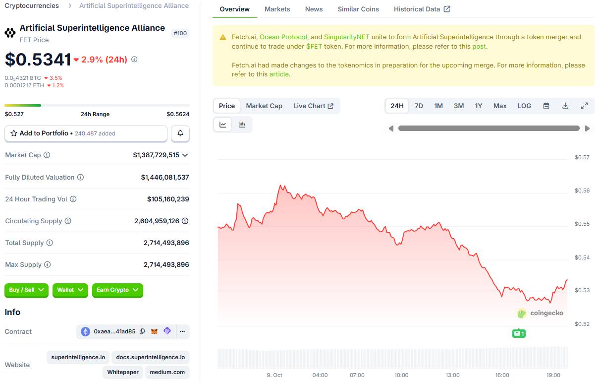 Tháng 3/2024, Fetch.ai, SingularityNET và Ocean Protocol công bố kế hoạch sáp nhập token, tạo ra một đồng token thống nhất gọi là ASI (Artificial Superintelligence) với vốn hóa pha loãng ước tính 7,5 tỷ USD.