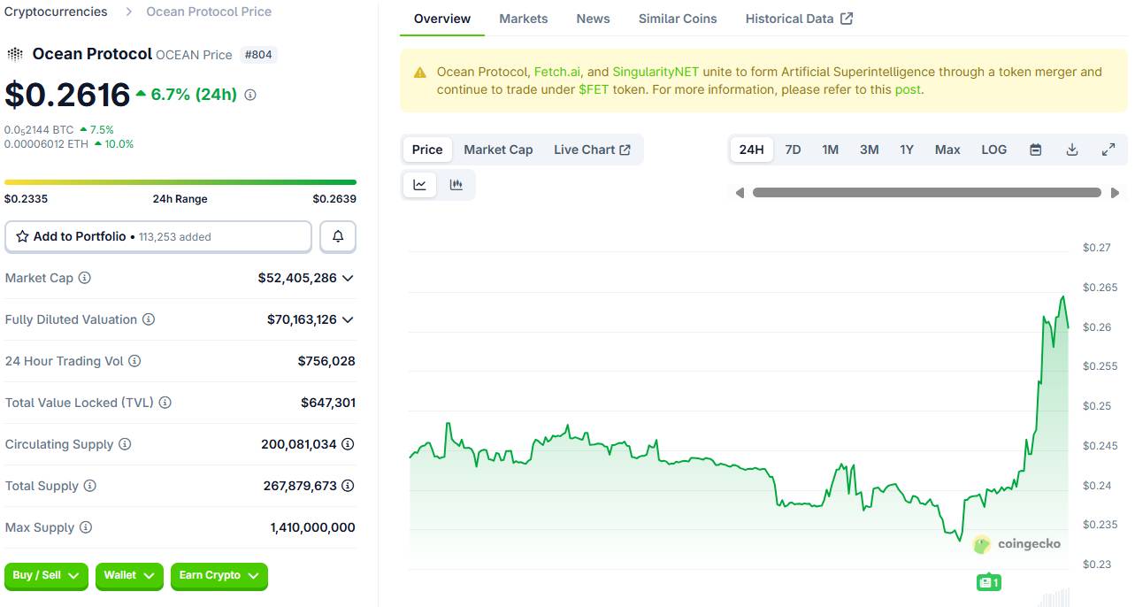 Sau thông báo, giá token FET giảm khoảng 3,8%, OCEAN thì vọt tăng 7% trong 24h gần nhất.