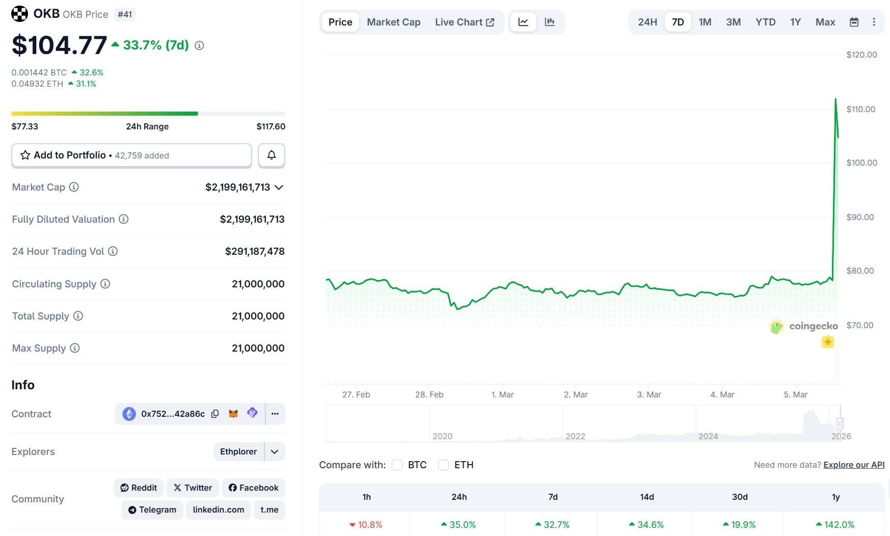 Biến động giá OKB trong 7 ngày gần nhất, ảnh chụp màn hình CoinGecko vào 08:55 PM ngày 05/03/2026