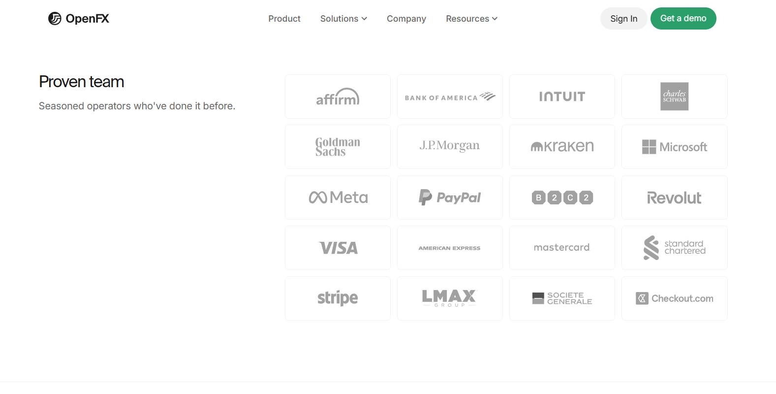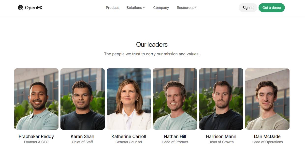 OpenFX được điều hành bởi đội ngũ có kinh nghiệm từ nhiều tổ chức tài chính lớn bao gồm Goldman Sachs, JP Morgan, Affirm, PayPal, Kraken và các tập đoàn công nghệ như Microsoft, Meta, Slack: