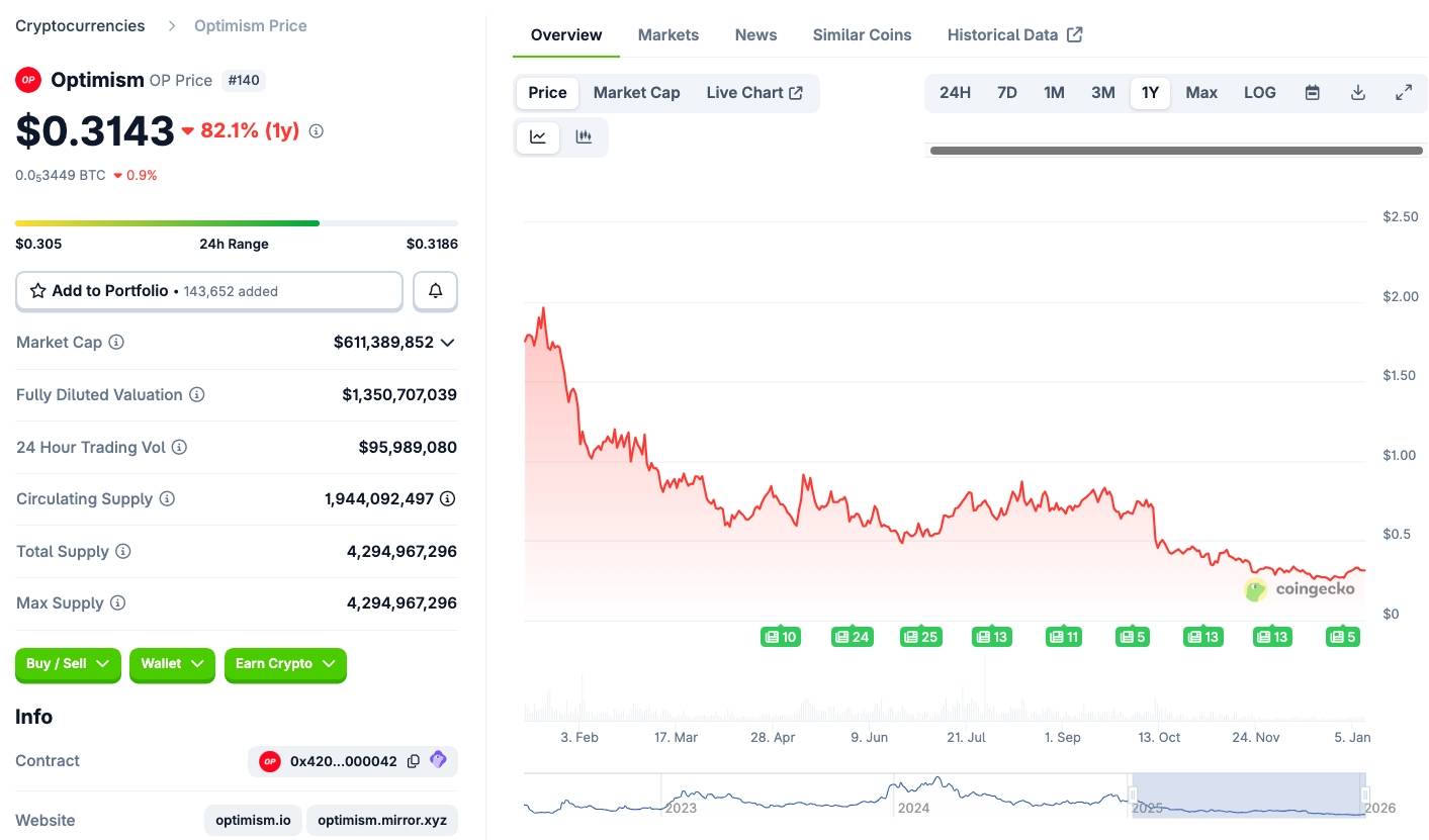 Biến động giá OP trong 1 năm qua, ảnh chụp màn hình trên CoinGecko vào lúc 09:40 AM ngày 09/01/2026
