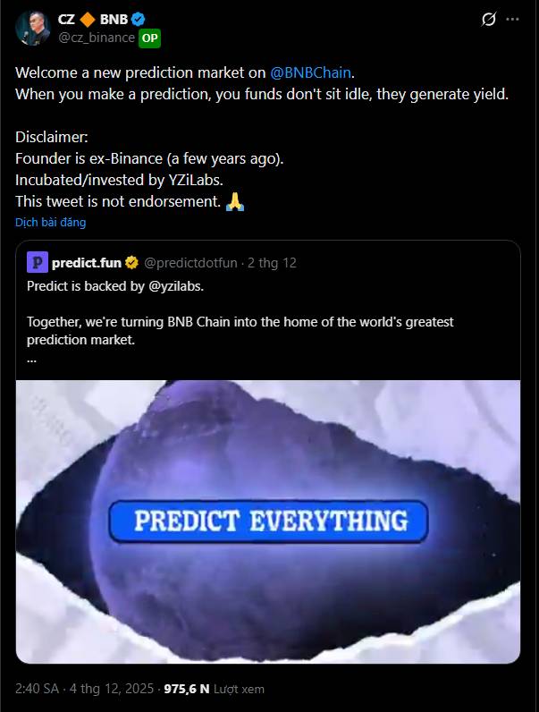 Predict.fun được Chapeng Zhao giới thiệu là dự án được phát triển bởi một cựu thành viên Binance và được ươm mầm bởi YZi Labs. Tuy nhiên, thông tin về người này vẫn chưa được tiết lộ.
