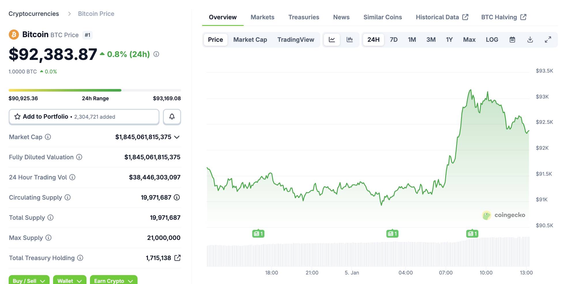 - Tại thời điểm viết bài, gía Bitcoin đang được giao dịch quanh mức 92.383 USD, tăng khoảng 1% trong vòng 24 giờ, theo dữ liệu từ CoinGecko.