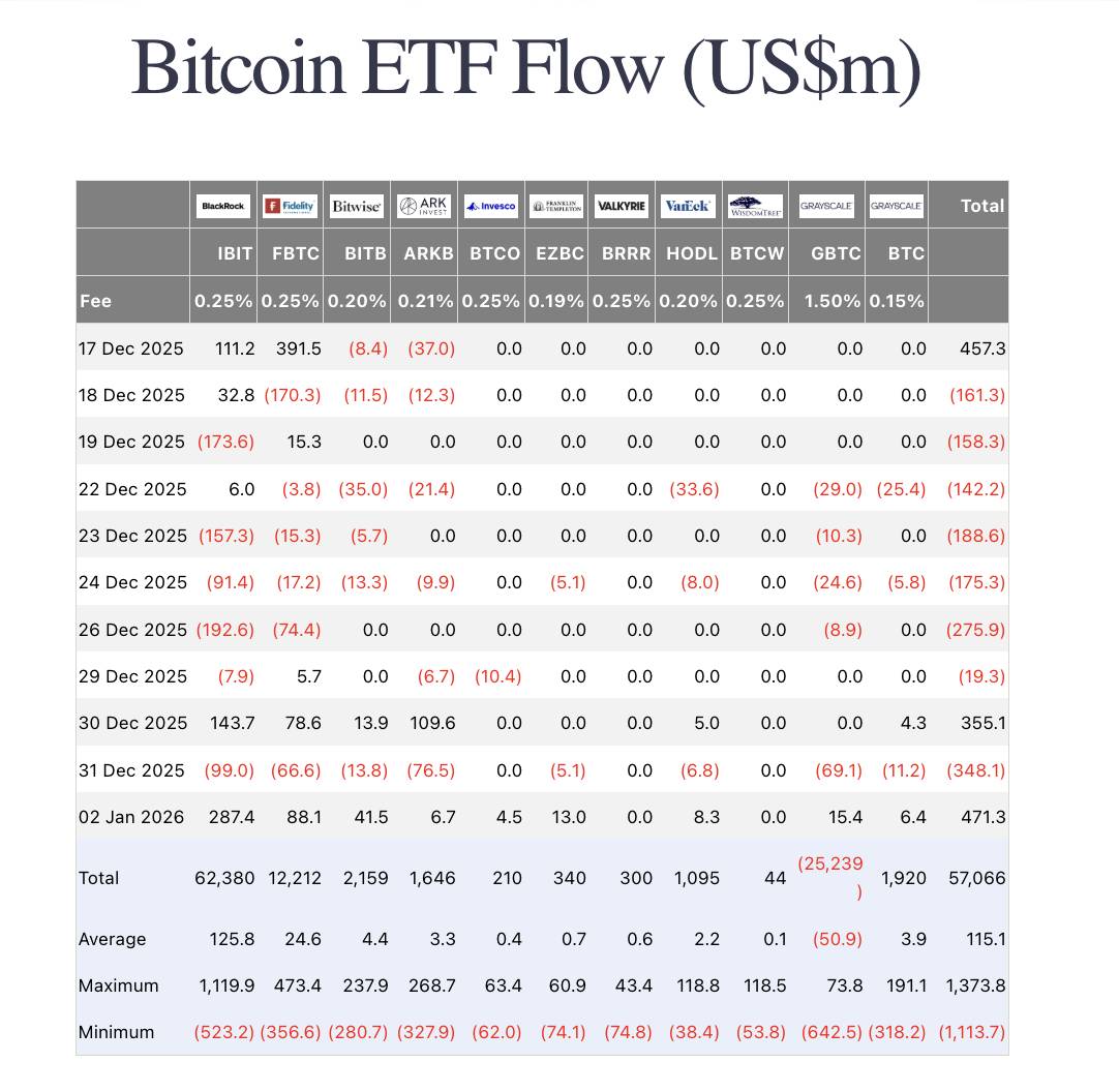 Thống kê dòng tiền của các quỹ ETF Bitcoin tại Mỹ. Nguồn: Farside Investors (05/01/2026)