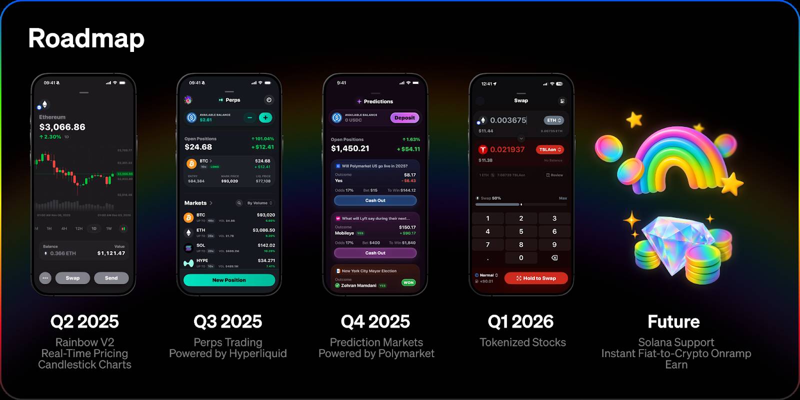 Lộ trình phát triển của Rainbow Wallet tập trung vào việc nâng cấp trải nghiệm giao dịch, bổ sung sản phẩm phái sinh, prediction market, tokenized stocks và hỗ trợ thêm blockchain Solana trong giai đoạn 2025–2026.