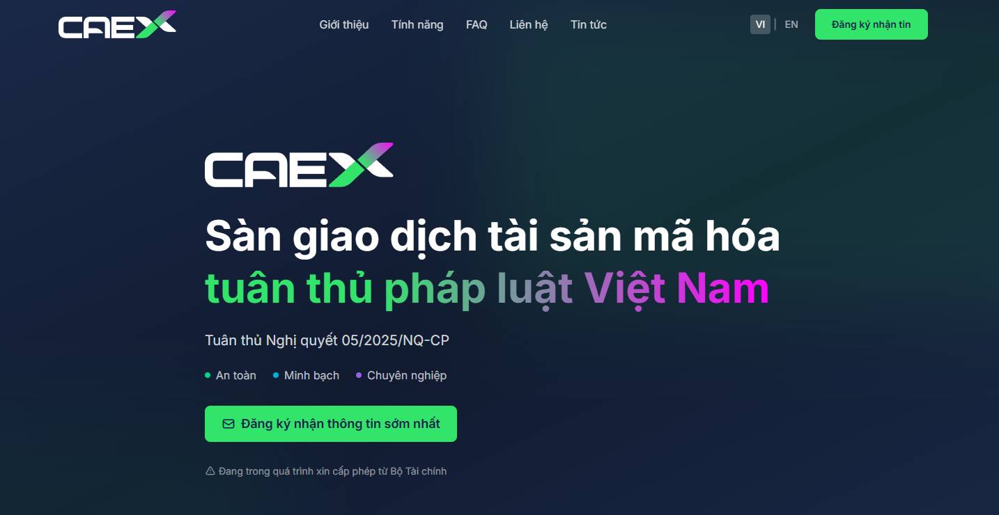 - Dự kiến Quý 03/2026: Chính phủ Việt Nam dự kiến cho phép vận hành thí điểm sàn giao dịch tài sản mã hóa. CAEX đang hướng tới mục tiêu chính thức hoạt động trong giai đoạn này, sau khi được cấp phép.