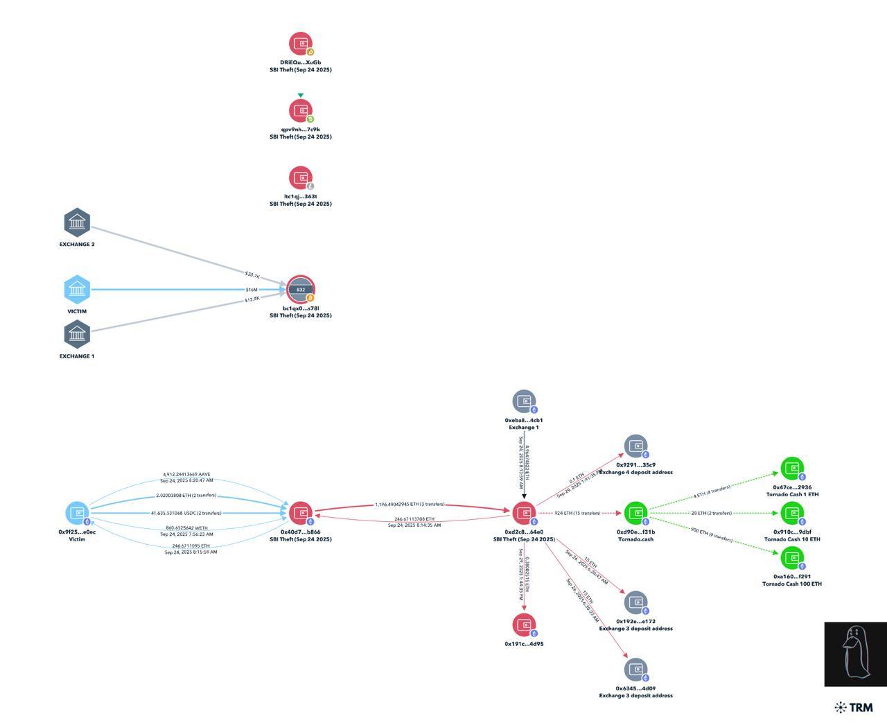 ZachXBT cho biết số tiền bị đánh cắp được chia nhỏ, đưa qua 5 sàn giao dịch tức thời rồi đổ vào Tornado Cash, dịch vụ "trộn tiền" từng bị Bộ Tài chính Mỹ "phong sát" năm 2022 - đầu năm 2025, một tòa án ở bang Texas đã đi đến kết luận rằng cơ chế hoạt động của Tornado Cash diễn ra phi tập trung do đó không thể bị xem là một chủ thể để bị trừng phạt.