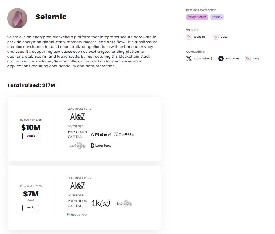 Vào tháng 11/2025, Seismic đã thành công gọi vốn 10 triệu USD trong vòng do a16z crypto dẫn dắt, cùng sự tham gia của Polychain, Amber Group và nhiều quỹ khác, nâng tổng vốn lên 17 triệu USD.
