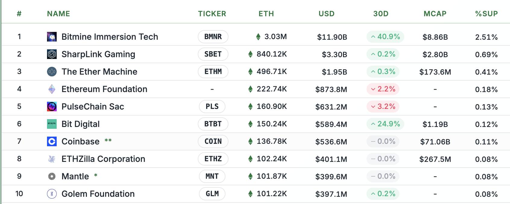 Thống kê 10 công ty đại chúng nắm giữ ETH hàng đầu trên thế giới. Nguồn: strategicethreserve.xyz (Ngày 17/10/2025)