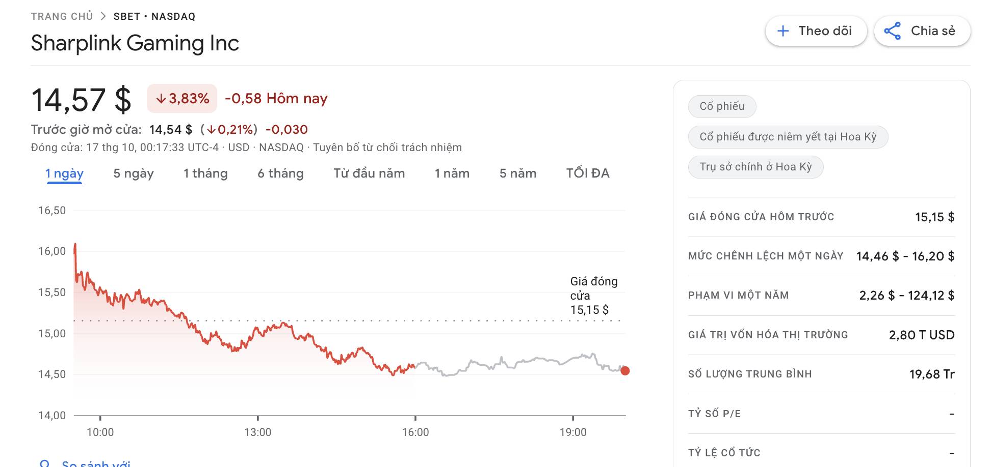 - Mặc dù vậy, giá cổ phiếu SBET vẫn có nhịp điều chỉnh sau thông báo phát hành. Trong phiên 17/10, SBET giao dịch quanh mức 14,57 USD, giảm hơn 3,8% trong 24 giờ, ghi nhận mức giảm gần 15% trong vòng một tháng qua, đưa vốn hóa thị trường về mức xấp xỉ 3 tỷ USD, .