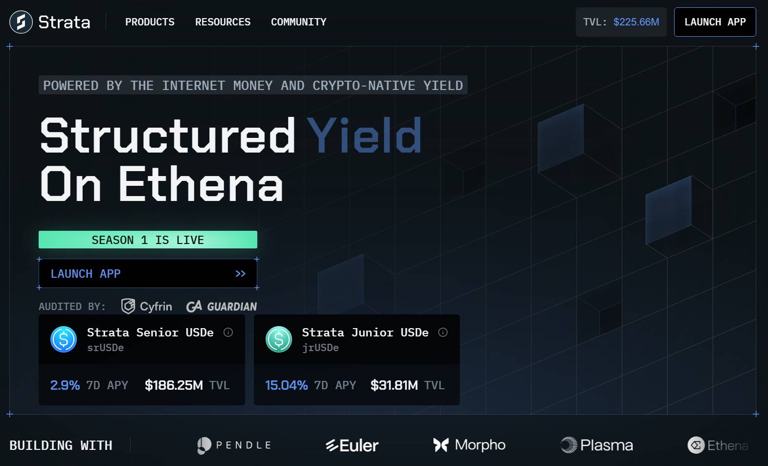 - Giao thức phân tầng rủi ro vĩnh viễn: Strata là một giao thức đưa mô hình tài chính cấu trúc vào Web3 thông qua cơ chế phân tầng rủi ro vĩnh viễn, cho phép người dùng tùy chỉnh mức độ rủi ro và lợi nhuận khi tham gia các chiến lược sinh lời on chain, tiêu biểu là sUSDe của Ethena. Cách tiếp cận này giúp người dùng không còn phải chấp nhận một hồ sơ rủi ro chung như trong phần lớn các sản phẩm DeFi truyền thống.