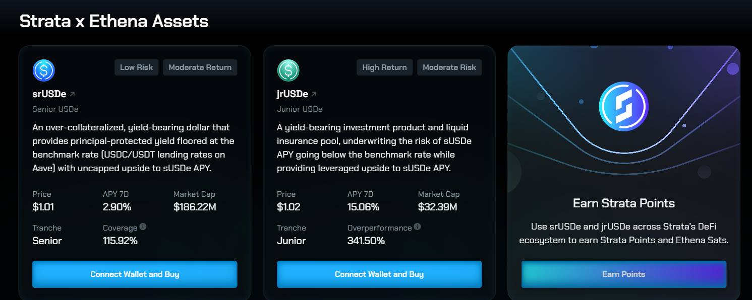 - Chương trình Strata Points: Strata triển khai hệ thống điểm thưởng nhằm khuyến khích người dùng tham gia sớm và cung cấp thanh khoản dài hạn. Người nắm giữ srUSDe hoặc jrUSDe không chỉ nhận lợi nhuận từ tài sản mà còn có thể tích lũy đồng thời Strata Points và Ethena Points, tạo thêm động lực gắn bó với giao thức trong dài hạn.