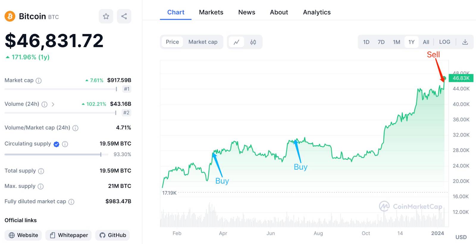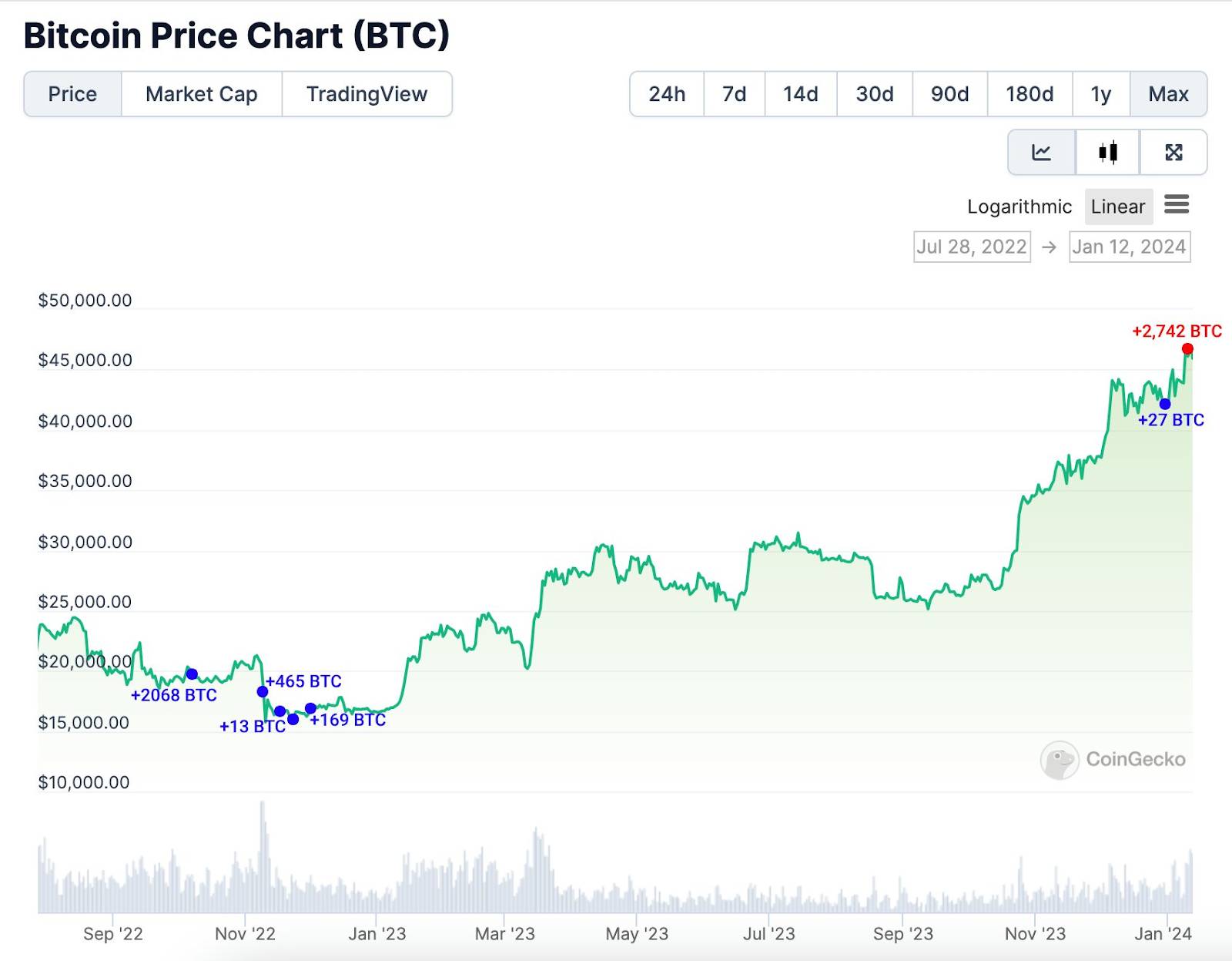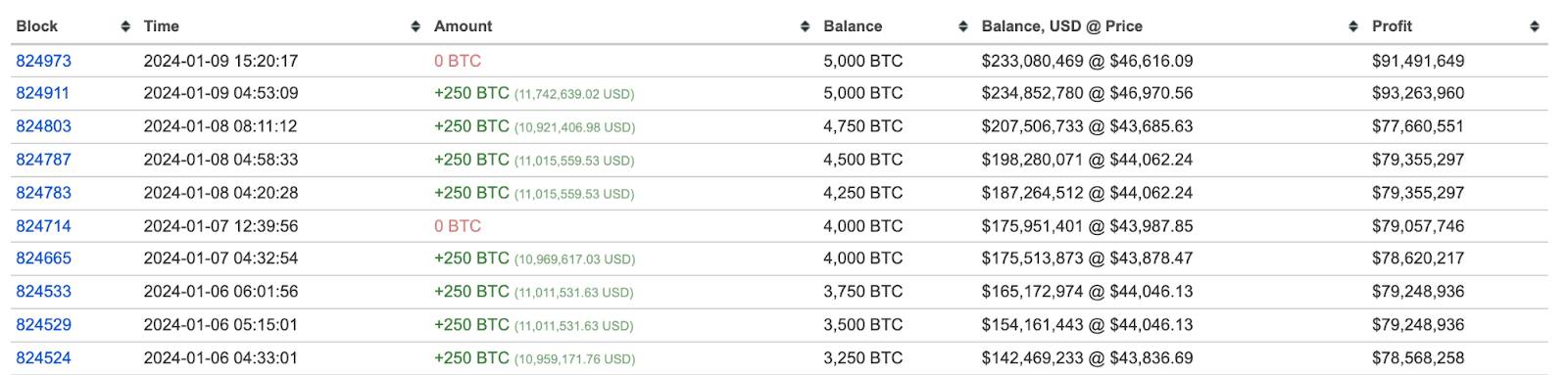 Trước đó ví đã mua lượng BTC này với vốn khoảng 53 triệu USD trên Binance từ tháng 10 năm 2022 đến cuối tháng 12 năm 2023, với giá trung bình là 19.337 USD. Như vậy với giá trị hiện tại của BTC, ví đã có lợi nhuận hơn 74 triệu USD.