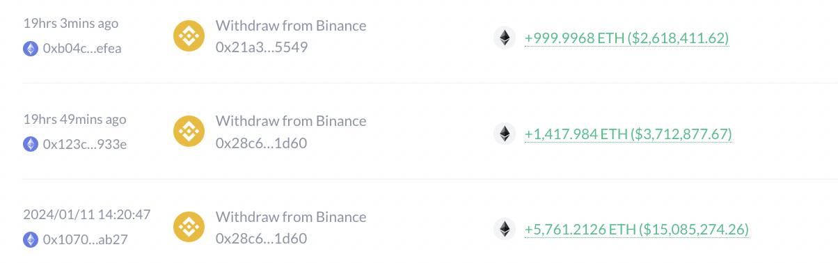 Sau đó, ví mang 8.700 ETH (20,56 triệu USD) lên Binance tại thời điểm giá ETH ở 2.364 USD từ ngày 9/11/2023.