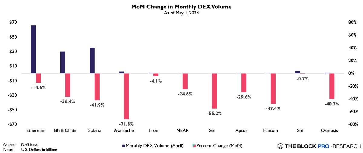 Hoạt động của người dùng trên các hệ sinh thái Layer 1 giảm mạnh, đáng lưu ý nhất là volume giao dịch, số lượng giao dịch và địa chỉ hoạt động trên các DEX cũng giảm đáng kể,. Phí giao dịch trên các nền tảng lớn của Ethereum và Solana cũng giảm đáng kể.