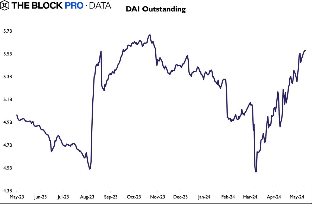 Tổng cung của DAI tăng 24%, từ 4,42 tỷ USD vào tháng 3 lên 5,48 tỷ USD vào tháng 5, đảo chiều xu hướng giảm trước đó. Sau khi USDC bị depeg, tỷ lệ lãi suất tiết kiệm DAI (DSR) đã được điều chỉnh nhiều lần, đạt đỉnh 15% vào tháng 3 vừa qua để thu hút tiền gửi và cạnh tranh với các stablecoin khác, làm tăng tổng cung một cách đáng kể.