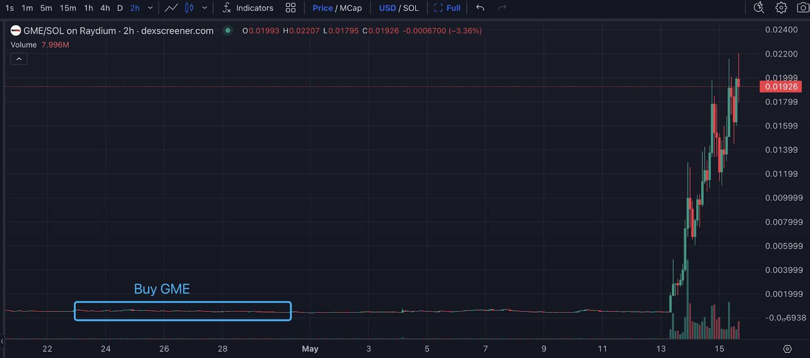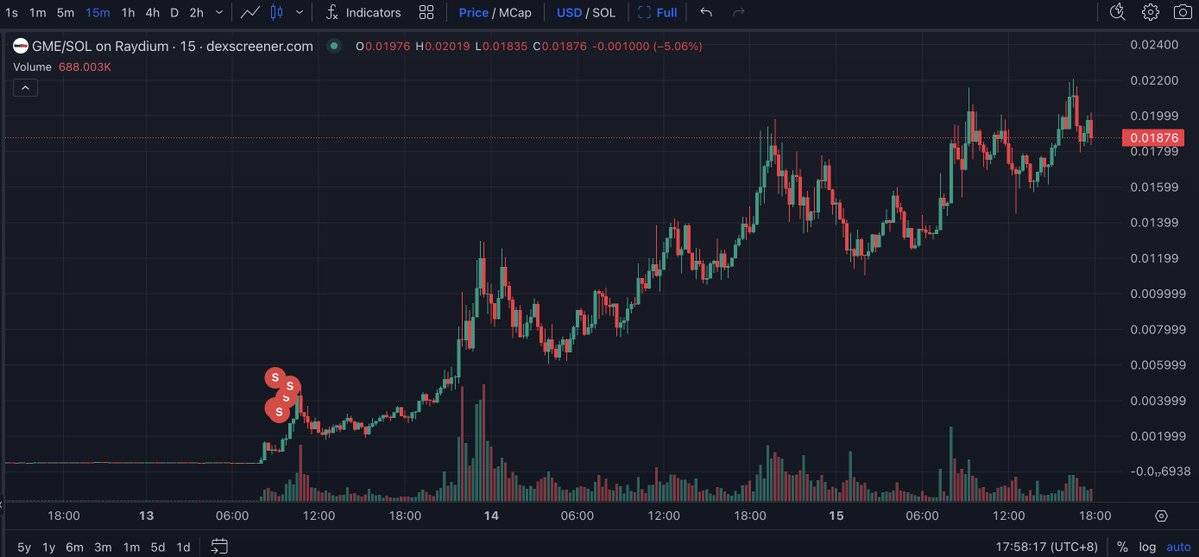 Một tài khoản X mang tên SHitGemHunter nhận thấy giá GME đang ở đáy. Vì vậy, ví bắt đầu mua GME trên Jupiter với vốn 48.000 USD để mua 95,78 triệu GME ở giá trung bình 0.0005 USD.