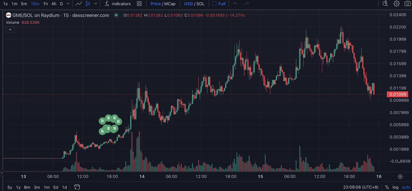 Sau khi giá GME giảm, ví đã sử dụng 200 SOL lợi nhuận trước đó để mua 4,14 triệu GME ở đáy. Sau đó, nhận thấy lực mua giảm, ví bán 11,88 triệu GME và nhận về 1.358 SOL (khoảng 198.000 USD), giữ lại 30 triệu GME.