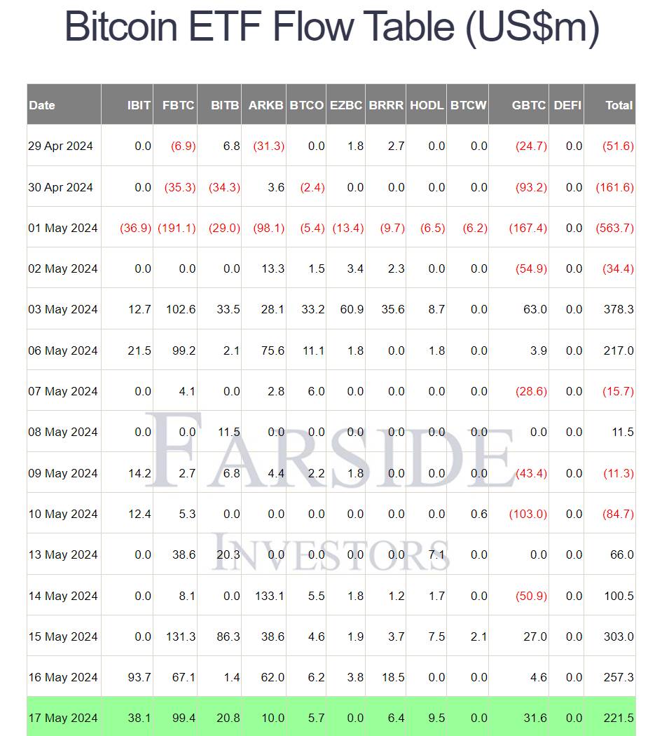Tuần này dòng tiền ETF BTC nhìn chung khả quan hơn khi có hàng trăm triệu USD chảy vào BTC dù có nhiều quỹ không có giao dịch trong vài ngày. Grayscale có dòng tiền ròng dương liên tiếp 3 ngày. Trong ngày 17/5, tổng dòng tiền ròng chảy vào BTC ETF Spot đạt mức dương 222 triệu USD.