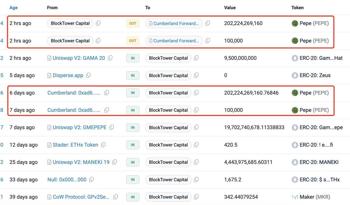 BlockTower Capital đã chuyển 202 tỷ PEPE (2,8 triệu USD) cho Cumberland khi giá PEPE phá vỡ mức 0,000014 USD.