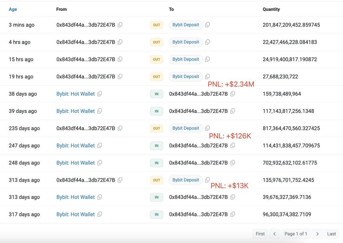 Ví giao dịch thông minh này đã giao dịch PEPE 3 lần và luôn thu được lợi nhuận cho giao dịch của mình. Mới đây vào ngày 22/5, ví đã chuyển 201,85 tỷ PEPE (2,83 triệu USD) lên Bybit để chốt lời. Như vậy win rate cho giao dịch PEPE là 100% và tổng lợi nhuận khoảng 2,48 triệu USD.