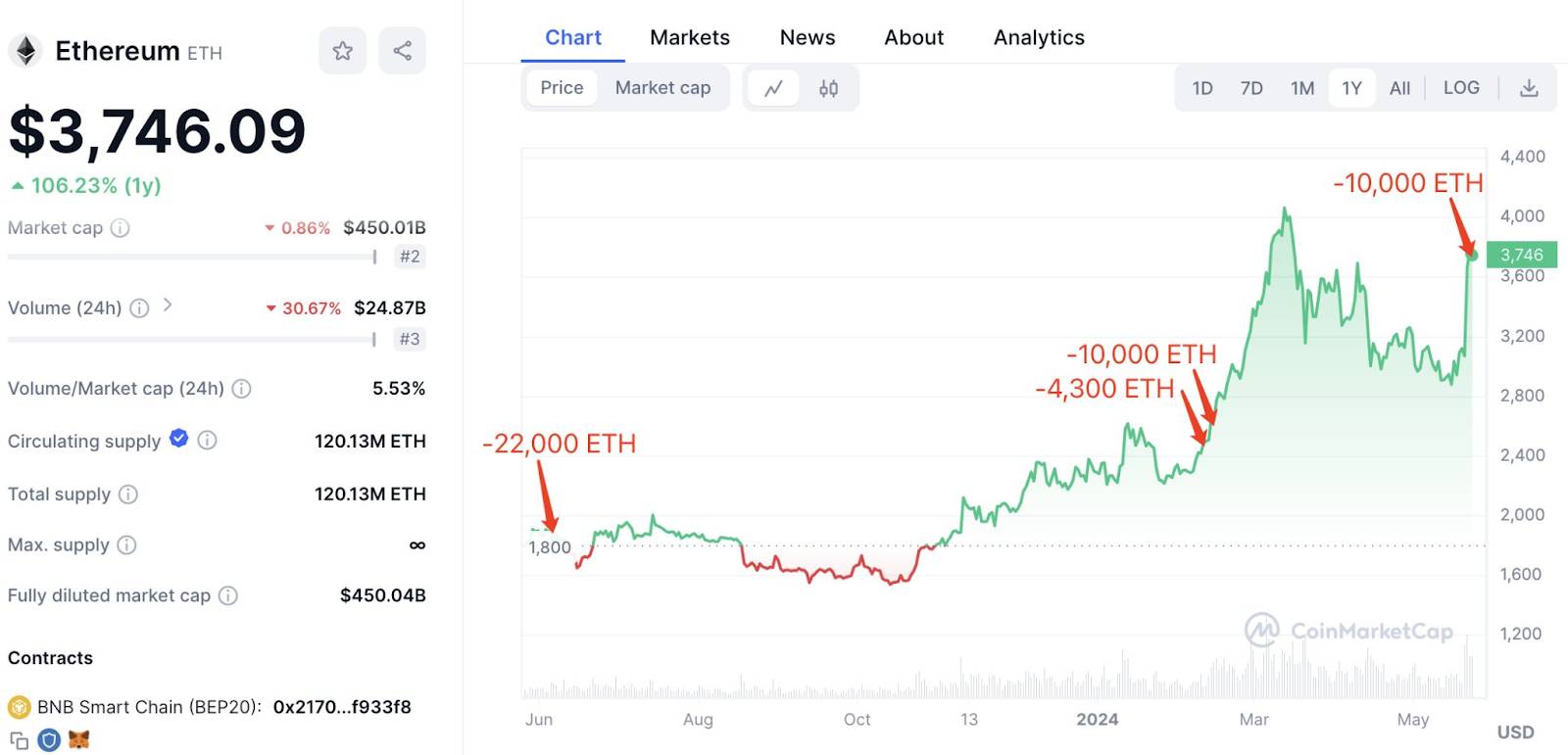 Cá voi này rút khỏi các sàn giao dịch tổng cộng 10.698 ETH (38 triệu USD) từ ngày 26/3 đến ngày 13/4 với giá trung bình là 3.551 USD. Lợi nhuận đạt được là 2,7 triệu USD.