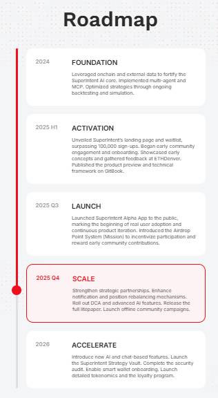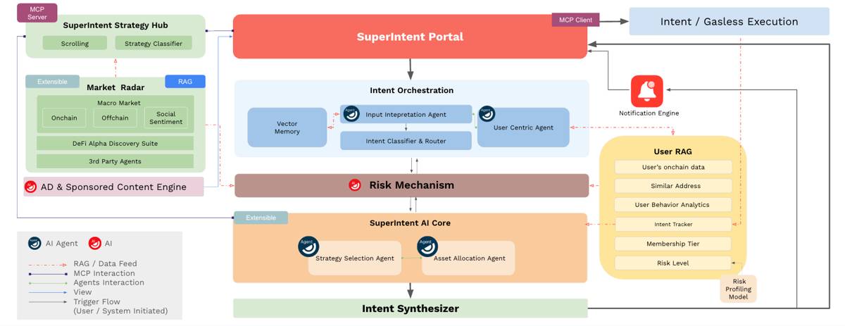 - Quản lý danh mục chủ động: SuperIntent gửi thông báo rủi ro và cơ hội (alpha signals) theo thời gian thực, đồng thời cho phép chuyển đổi hoặc tái cân bằng danh mục mà không cần rút tiền thủ công. Người dùng có thể linh hoạt rút vốn hoặc thay đổi chiến lược bất cứ lúc nào.