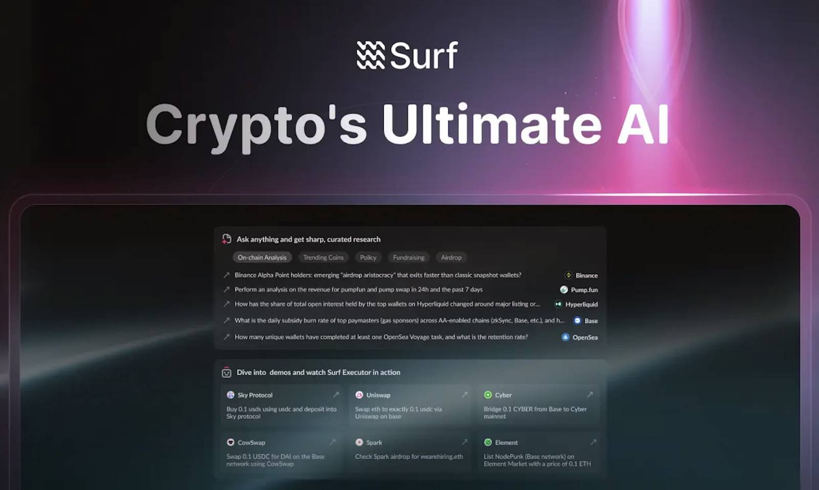 Surf là AI model được phát triển bởi Cyber dành riêng cho lĩnh vực crypto, có thể đọc và phân tích mọi thứ liên quan đến thị trường tài sản số thay cho người dùng. Nó có thể theo dõi và tổng hợp từ nhiều nguồn như biểu đồ, dòng tiền on-chain, tin tức, tweet KOL, tài liệu dự án… sau đó phản hồi lại câu hỏi của người dùng người dùng một cách nhanh chóng và chính xác.