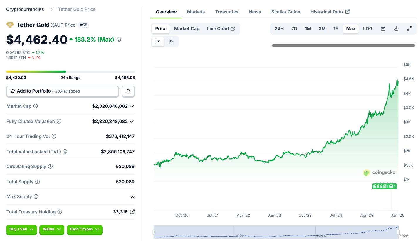 Biến động giá vàng trên toàn thời gian, ảnh chụp màn hình CoinGecko lúc 10:20 AM ngày 07/01/2026