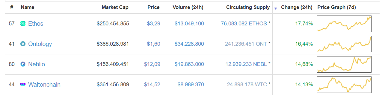 Chắc chắn vẫn còn là quá sớm để có thể kết luận rằng mùa mua bán nhộn nhịp các đồng altcoin đã chính thức bắt đầu. Tuy nhiên, một số các coin nhỏ lẻ hiện đang trình diễn phong độ vượt trội hơn cả Bitcoin hay top 10 trong những ngày qua. Ngày hôm nay, Ontology và Ethos đều đã ghi nhận mức tăng đến hơn 15%, trong khi Neblio và Waltonchain thì đã có chuỗi 5 ngày liên tục đi lên.