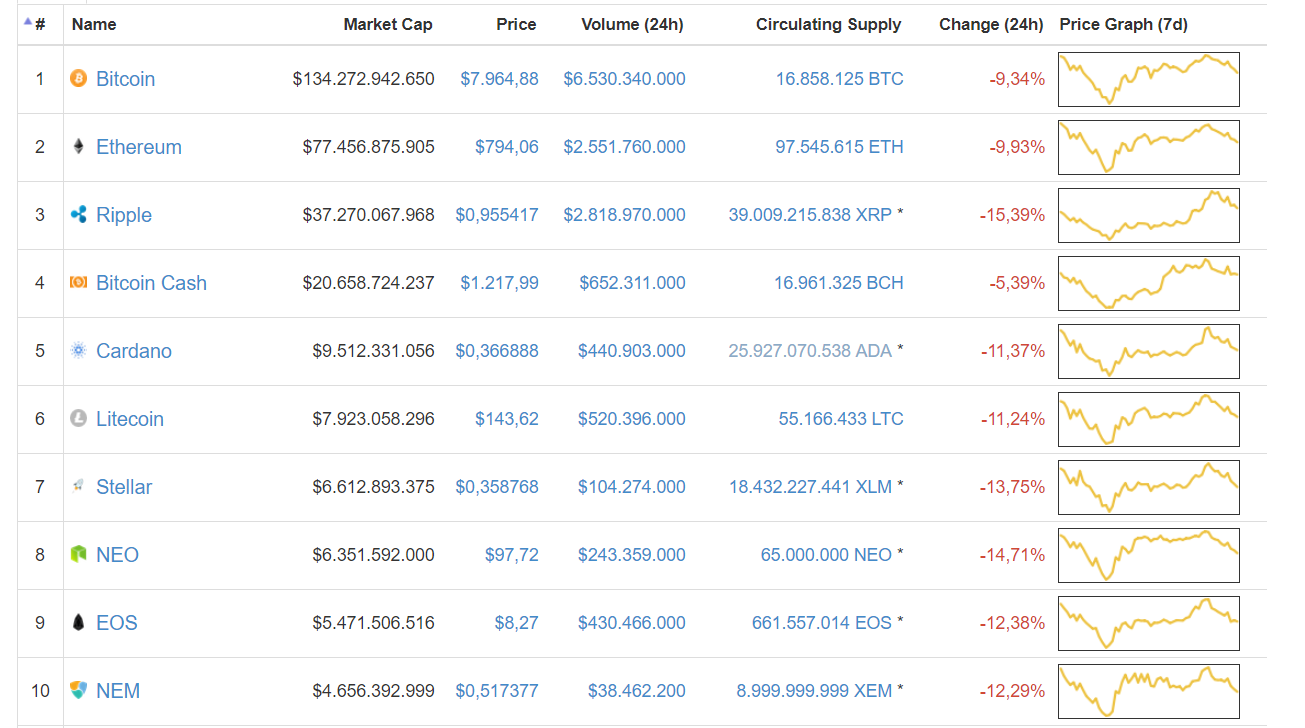 Chỉ chưa đầy 24 tiếng sau khi tăng trưởng ngoạn mục và chạm mức vốn hoá 450 tỉ đii la Mỹ, thị trường tiền điện tử lại tiếp tục quay đầu sụt giảm. Các đồng tiền hàng đầu như Bitcoin, Ethereum, Ripple và Bitcoin Cash đều ghi nhận mức giảm điểm gần 10%.