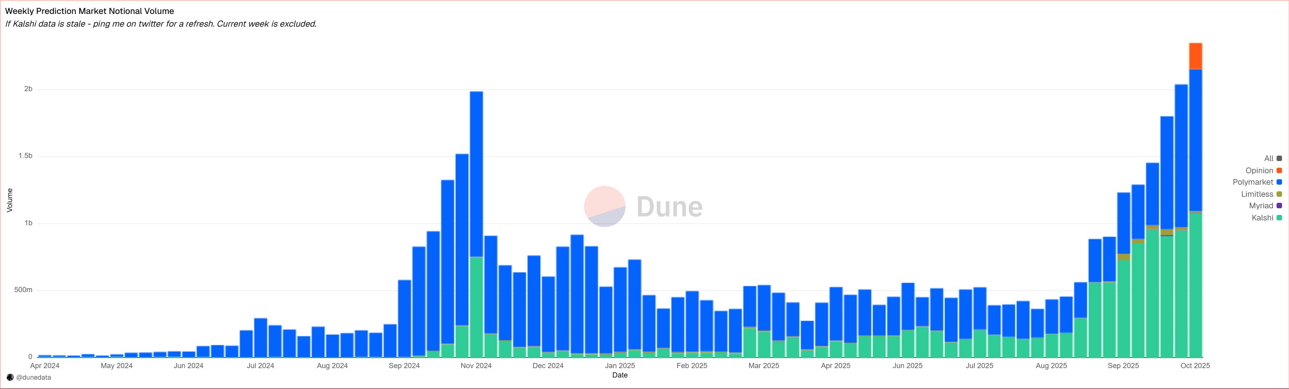 Khối lượng giao dịch hàng tuần của các nền tảng Prediction Market. Nguồn: Dune Analytic (28/10/2025)