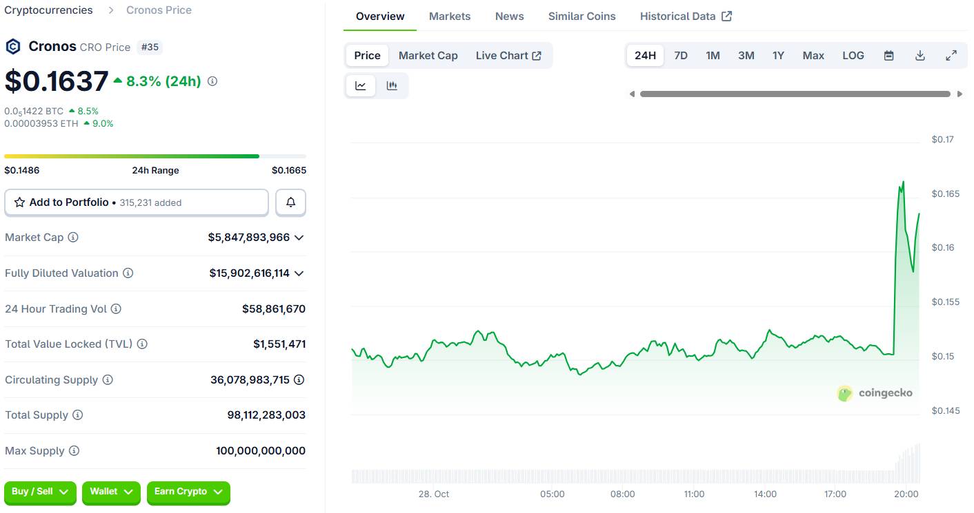 Giá token CRO đại diện hệ sinh thái Cronos lập tức tăng 11% ngay sau tin tức, từ 0,15 USD lên 0,166 USD. Tại thời điểm bài viết, CRO đang giao dịch quanh 0,1637 USD.