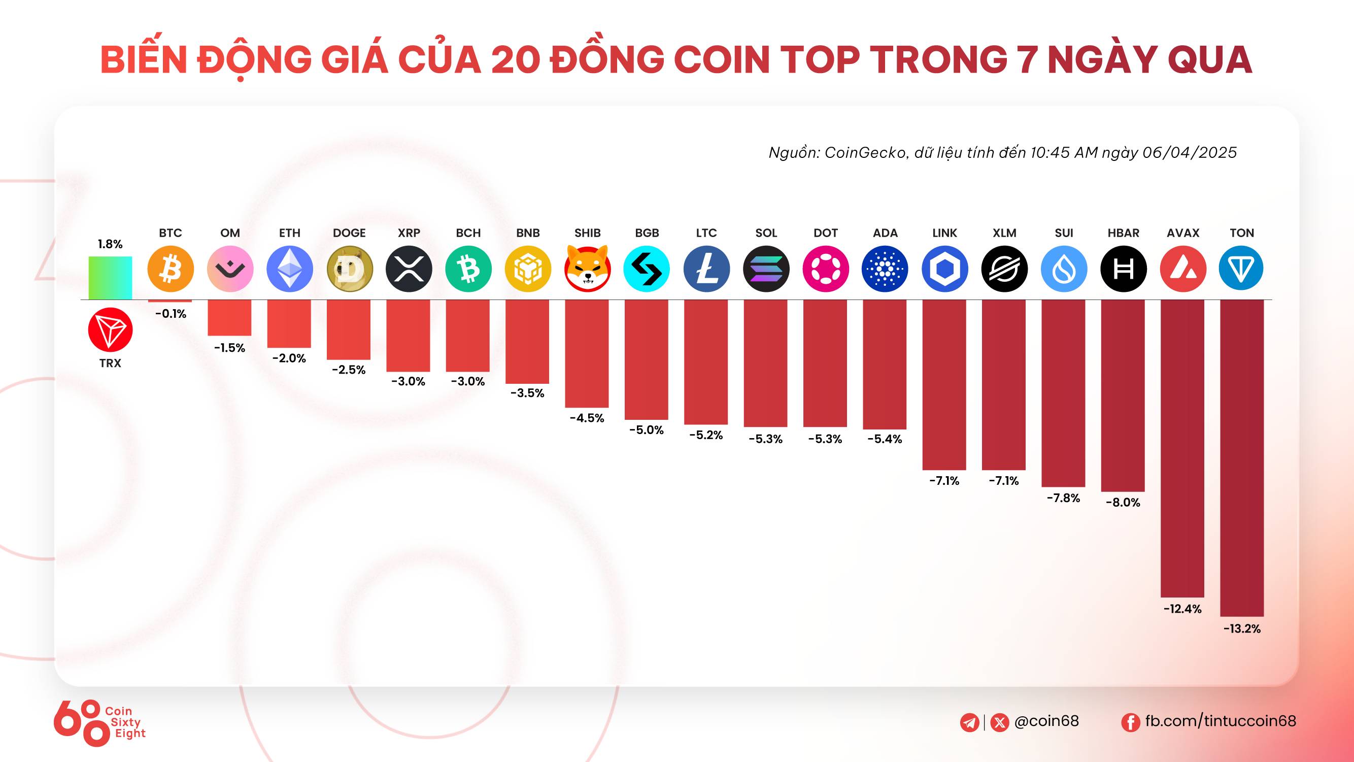 Biến động các đồng tiền mã hóa hàng đầu so với cách đây 7 ngày. Ảnh chụp màn hình Coin360 vào lúc 10:20 AM ngày 06/04/2025