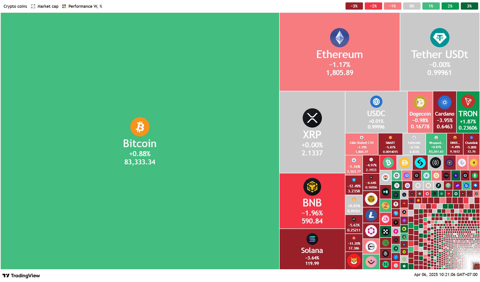 Biến động các đồng tiền mã hóa hàng đầu so với cách đây 7 ngày. Ảnh chụp màn hình Coin360 vào lúc 10:20 AM ngày 06/04/2025