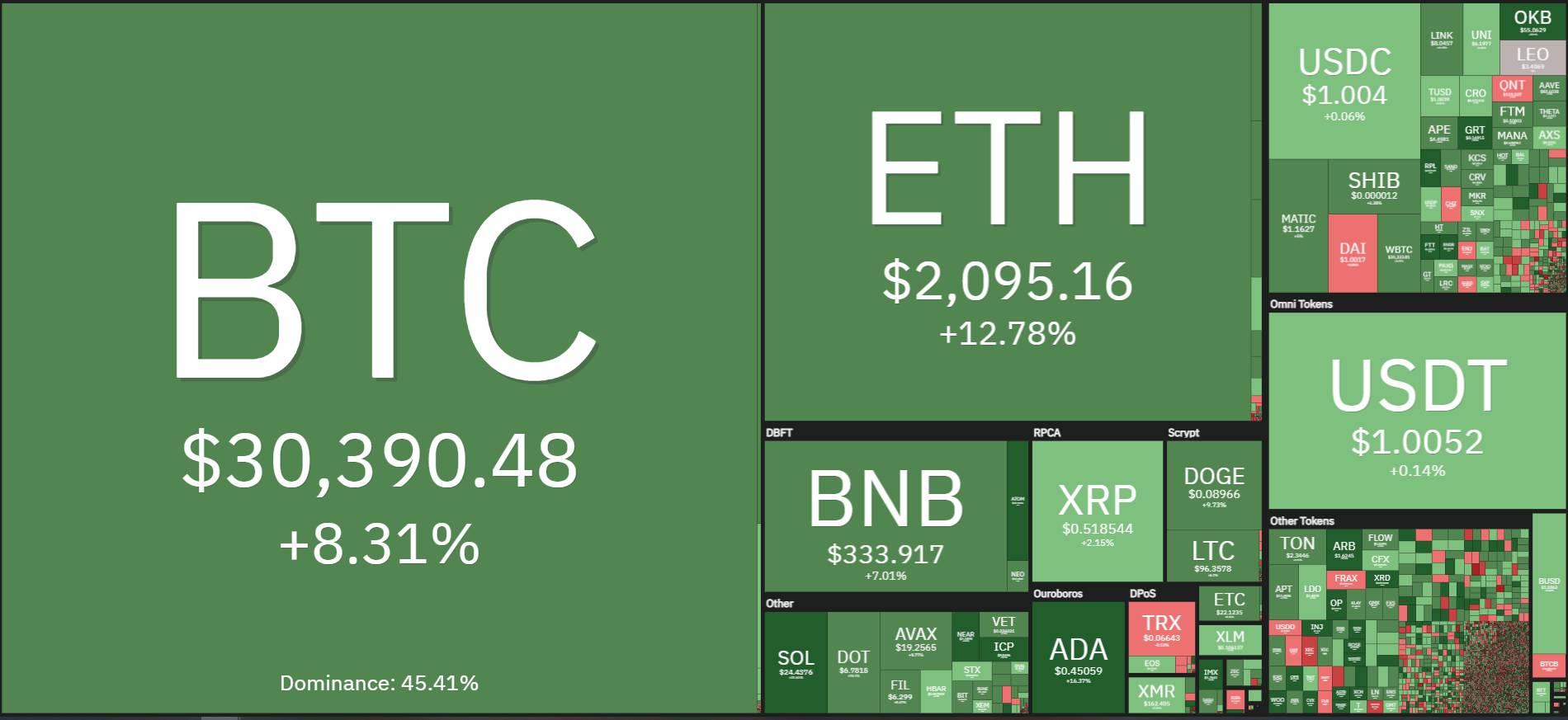 Biến động giá trị các đồng crypto hàng đầu so với cách đây 7 ngày, ảnh chụp màn hình lúc 11:00 AM ngày 16/04/2023. Nguồn: Coin360