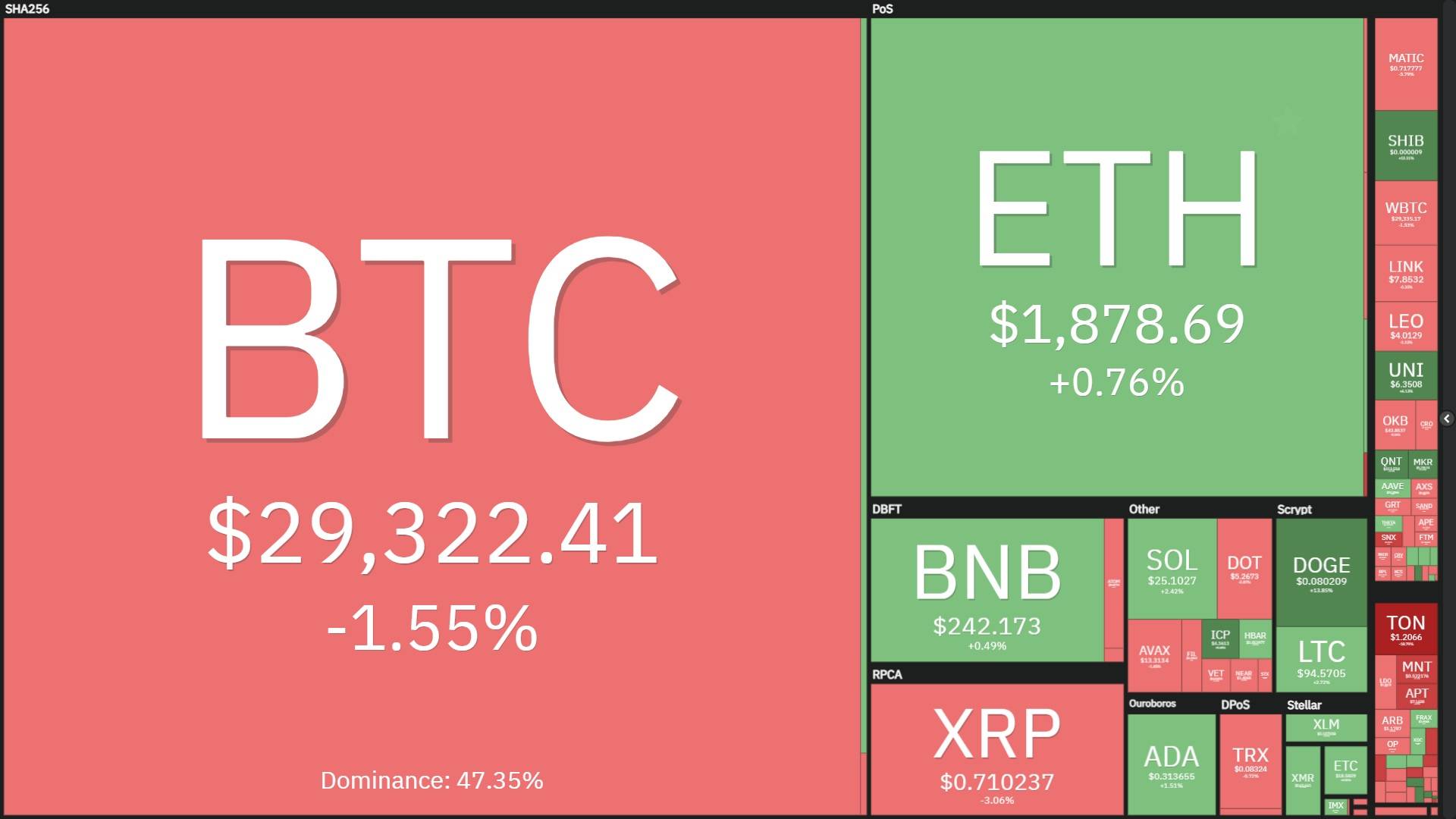 Biến động các đồng tiền mã hóa hàng đầu so với cách đây 7 ngày. Ảnh chụp màn hình Coin360 vào lúc 09:45 AM ngày 30/07/2023
