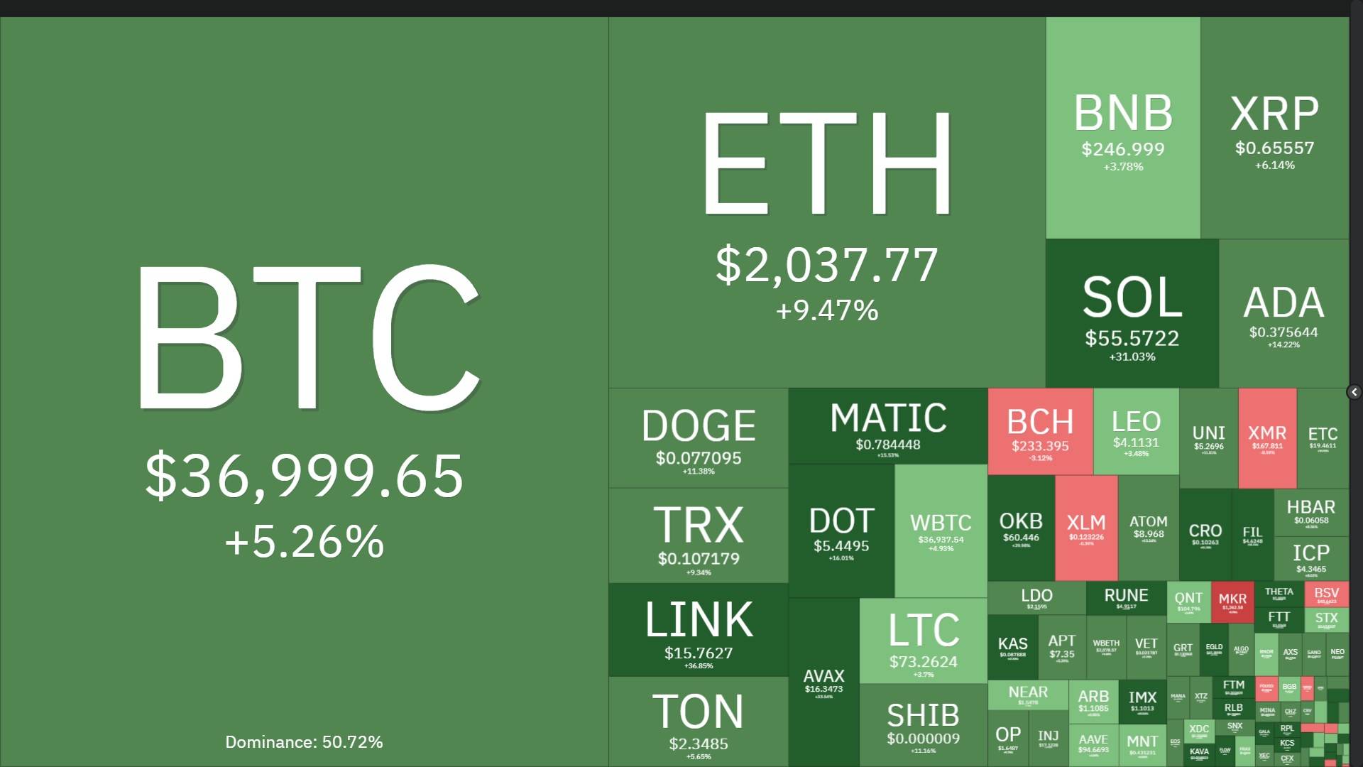 Biến động các đồng tiền mã hóa hàng đầu so với cách đây 7 ngày. Ảnh chụp màn hình Coin360 vào lúc 08:05 AM ngày 12/11/2023