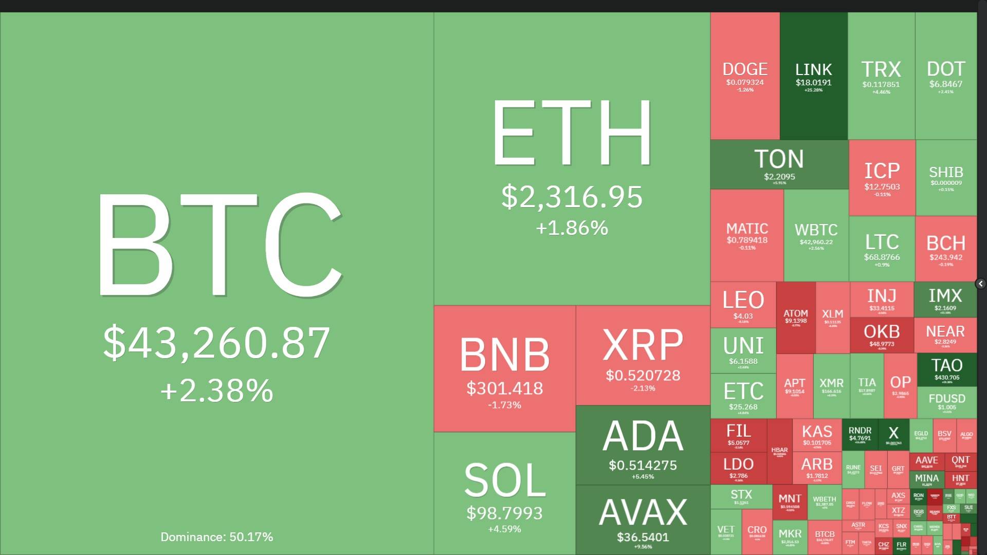 Biến động các đồng tiền mã hóa hàng đầu so với cách đây 7 ngày. Ảnh chụp màn hình Coin360 vào lúc 08:55 AM ngày 04/02/2024