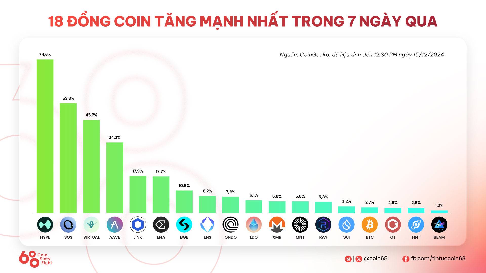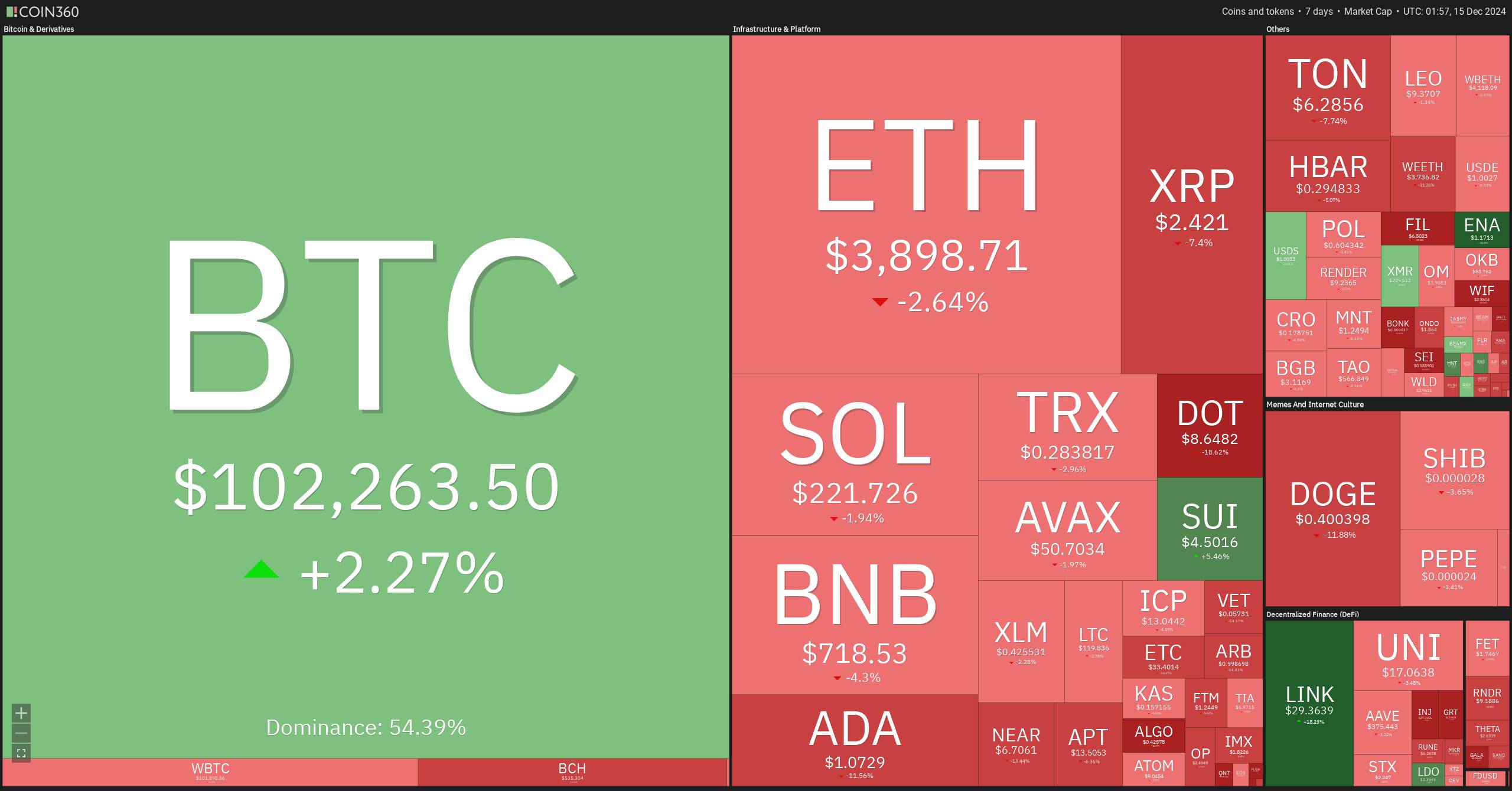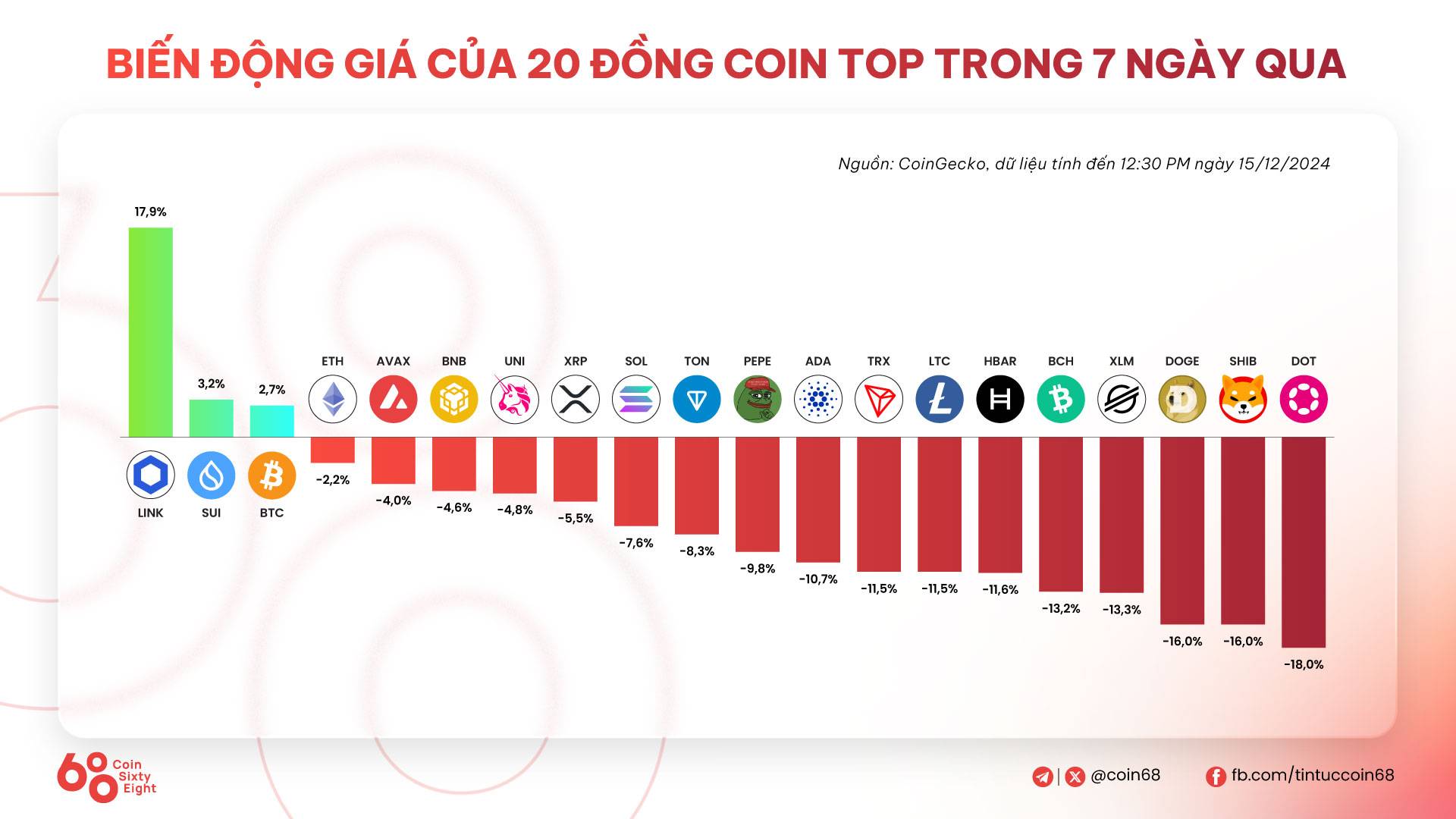 Biến động các đồng tiền mã hóa hàng đầu so với cách đây 7 ngày. Ảnh chụp màn hình Coin360 vào lúc 08:55 AM ngày 15/122024