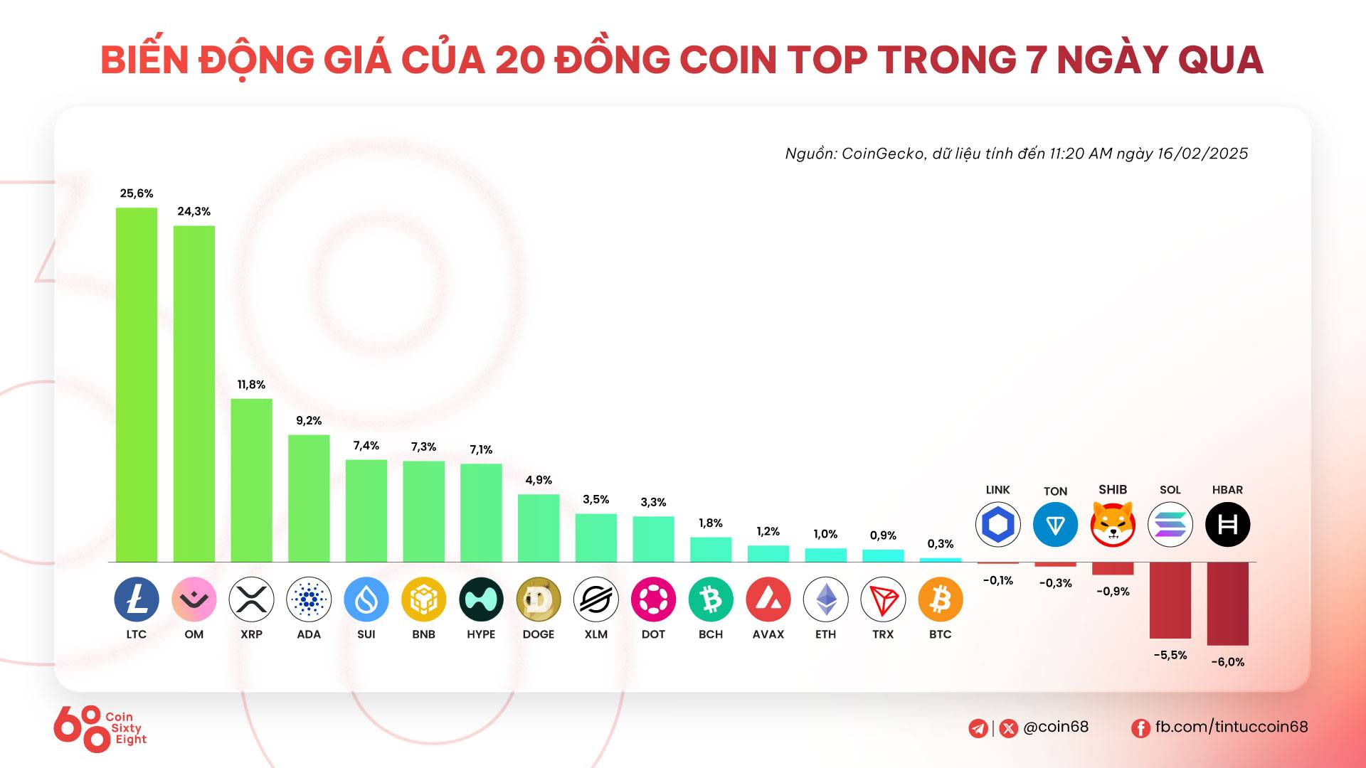 Biến động các đồng tiền mã hóa hàng đầu so với cách đây 7 ngày. Ảnh chụp màn hình TradingView vào lúc 10:00 AM ngày 16/02/2025
